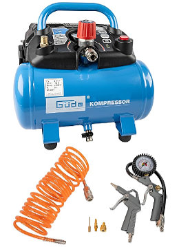 An Ausstattung mangelt es dem Güde AIRPOWER 190/08/6* nicht. Manometer, Druckluftminderer, Sicherheitsventil, Druckluftkupplung und Kondenswasserablassventil sind genauso vorhanden wie natürlich ein Ein-/Ausschalter, ein integrierter Druckschalter und ein praktisches Ablagefach. Auch an Ausblaspistole, Reifenfüller, Spiralschlauch in 5 m Länge und Adapter für Bälle, Fahrradreifen und Luftmatratzen wurde gedacht.